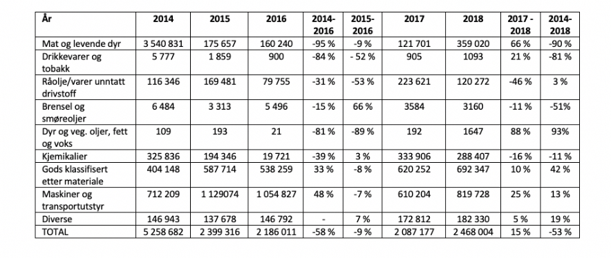 Den pågående økonomiske konfrontasjonspolitikken mellom Russland og Norge er noe begge land taper på. Handelen mellom Norge og Russland har fått en knekk etter innføringen av sanksjonene. Tallene fra Statistisk sentralbyrå viser hvordan det har preget ulike marked, tabellen nedenfor viser hvordan siste år har preget norsk eksport til Russland (summer i 1000 NOK):