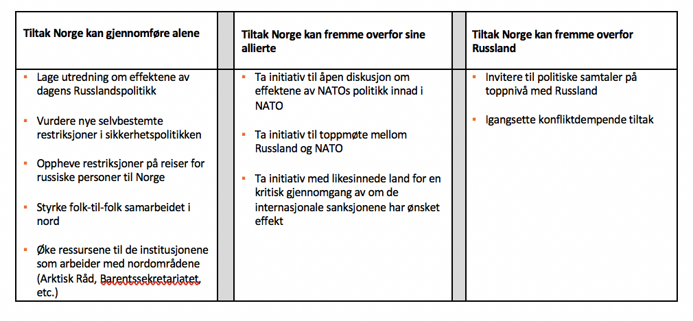 Nedenfor følger en tabell med oversikt over hvilke politiske tiltak Norge kan gjennomføre for å bedre bilaterale relasjoner med Russland:
